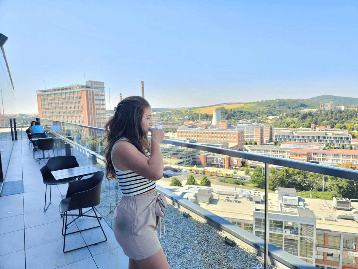 Káva s nejlepším výhledem na Zlín? Vychutnejte si ji v Cafe & Bar Galerie Desítka na střeše Obchodního domu Zlín s kávou a dezerty od Bistrotéky Valachy a nádherný západem slunce nad městem.