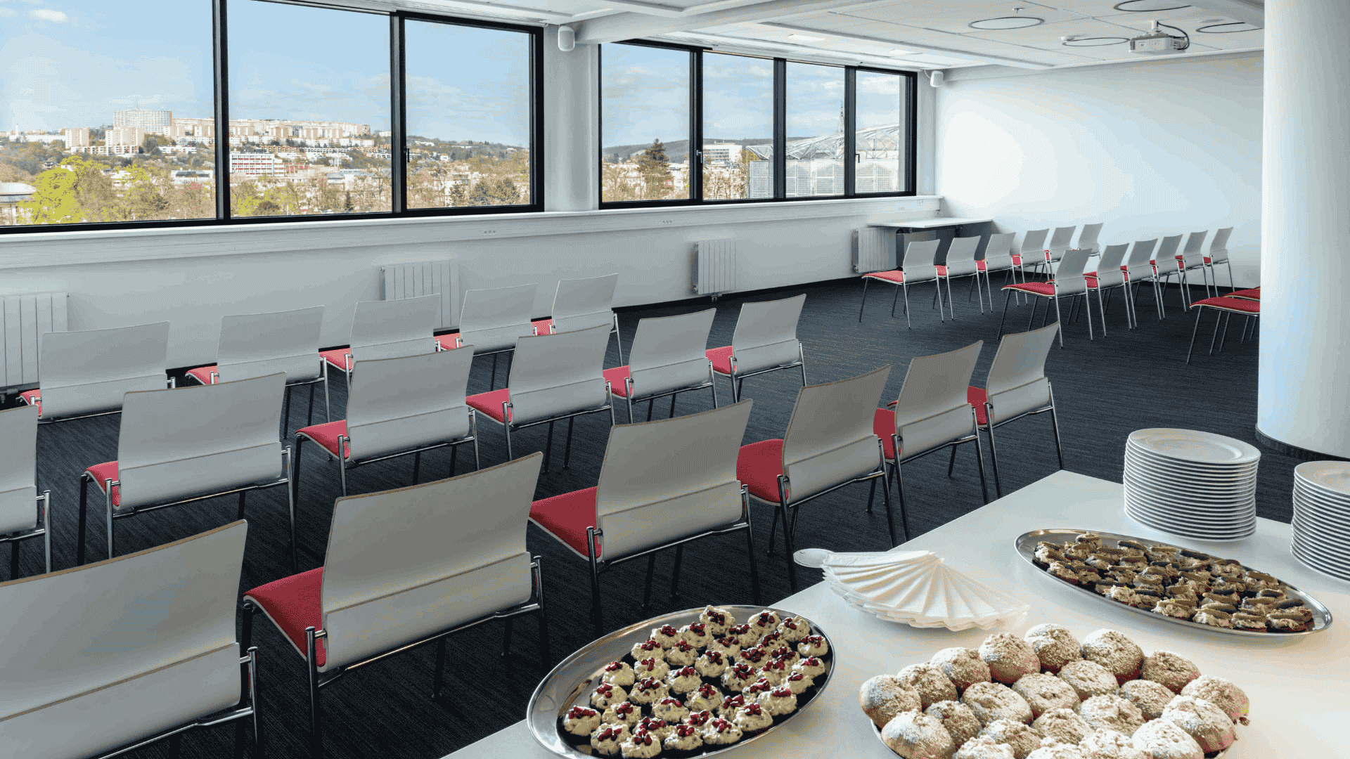 Konferenční prostor až pro 200 osob s nádherným výhledem na celé město Zlín. Variabilní konferenční sál, který můžete využít pro přednášky, meetingy, ale i rauty, firemní večírky nebo brunch s partnery.